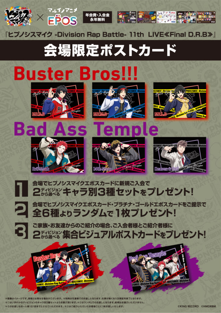 会場内で「ヒプノシスマイクエポスカード」を新規ご入会いただいたお客さまに、会場内当ブースにて2ディビジョンから選べる「ポストカード 全 3 種 コンプリートセット」をプレゼント!
