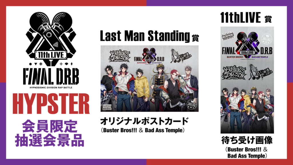 「ヒプノシスマイク -Division Rap Battle- 11th LIVE ≪Final D.R.B≫Buster Bros!!!&Bad Ass Temple」の会場物販が決定しました。また、「ヒプノシスマイクエポスカード」、「オンラインくじ」、「オフィシャルファンクラブ“HYPSTER”」のブース出店が決定いたしました!